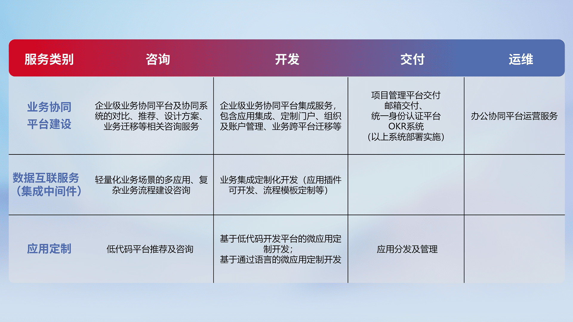 针对钉钉、、、、企微、、IDaas等平台级产品提供产品的规划、、方案、、、、交付、、、、定制化开发等服务,,,实现如统一协同办公、、、、智能客户服务、、、、混合会议管理、、、智能数据查询、、、、等业务场景,,,实现数字化转型。。。。