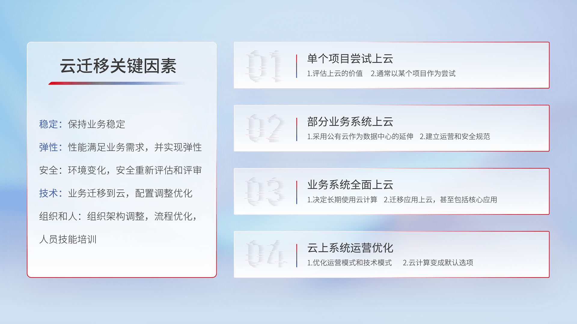 结合实际业务,,,从规划设计、、云平台选型、、、云原生改造、、数据迁移、、、、集成交付,,迁移全过程为客户识别最佳上云路径,,,做好风险识别管理,,,,设计网络架构、、、身份权限、、、安全审计合规、、、操作审计、、、、日志审计、、、监控告警策略、、多站点容灾设计等,,,,对云上基础设施进行整体规划,,,提升IT治理水平,,以满足弹性、、高可用、、高性能的需求。。。。
