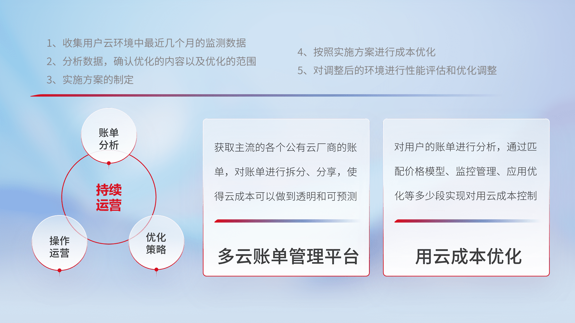 通过灵活运用多种自动化迁移工具,,,帮助企业用户实现业务和数据高效 、、、、稳定的上云迁移和云上迁移,,,,采用自研多云纳管平台,,,以中立管理模式,,,,解决多组织、、、、多云、、多运维厂商的复杂关系的管理,,保证多云平台资源配置的一致性,,实时掌控云资源运行数据,,运用智能化工具分析云资源多云平台的管理服务,,透明化管理成本支出,,,用云成本可预测、、、、用云费用可优化、、、云资源配额有据可依。。