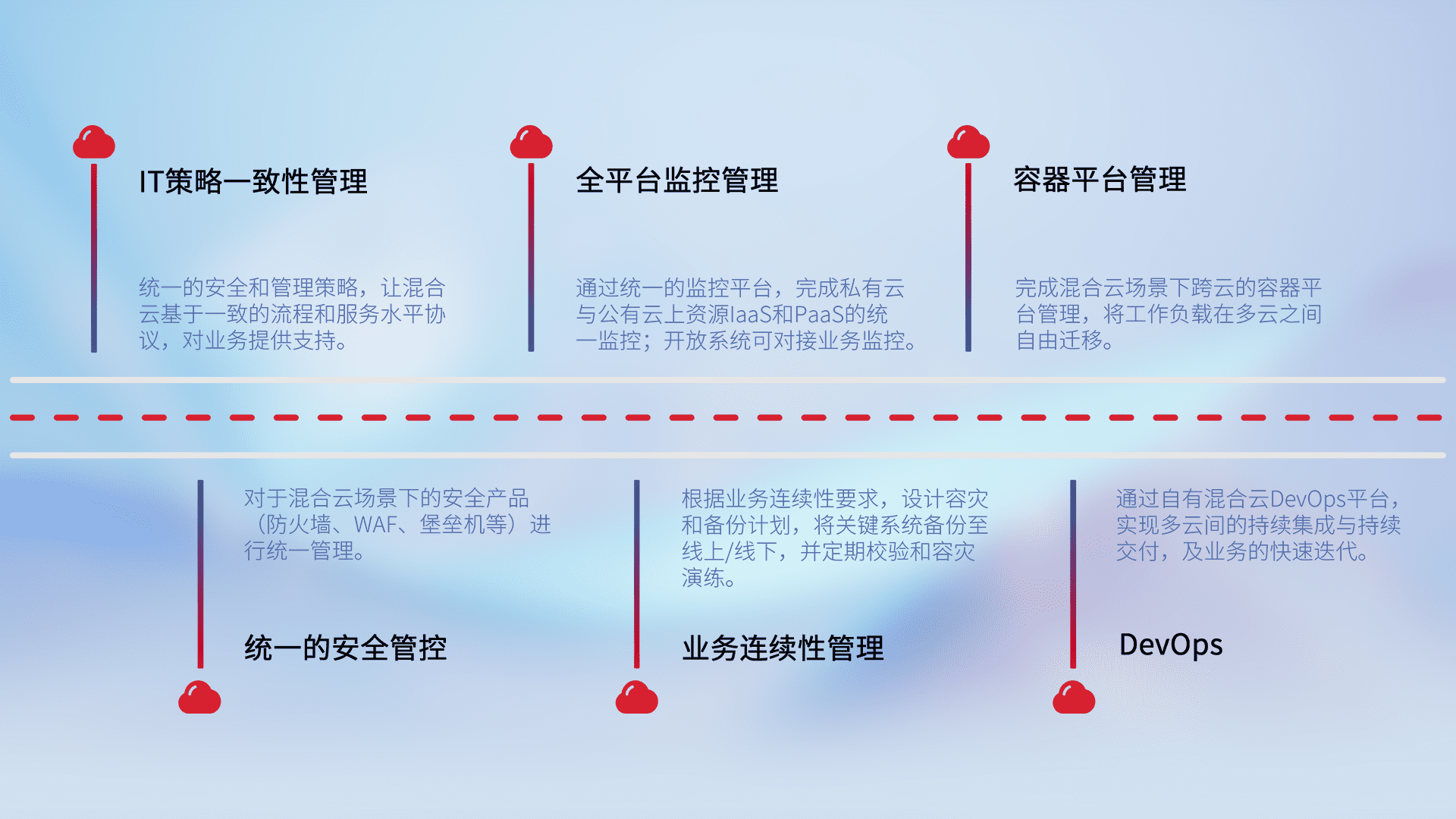 通过多云纳管,,,,以统一的资源数据模型把客户的云资源进行抽象和封装,,,,进而实现对多云资源的统一操作,,保障云资源管理的可靠性、、、稳定性与可用性。。。量身定制化运维内容,,,,配置、、、开发运维、、、补丁管理、、、、备份、、、、监控、、认证和访问管理、、、审计和日常巡检等,,,,保障在用云过程中的可靠度,,,稳定度以及高可用率。。。