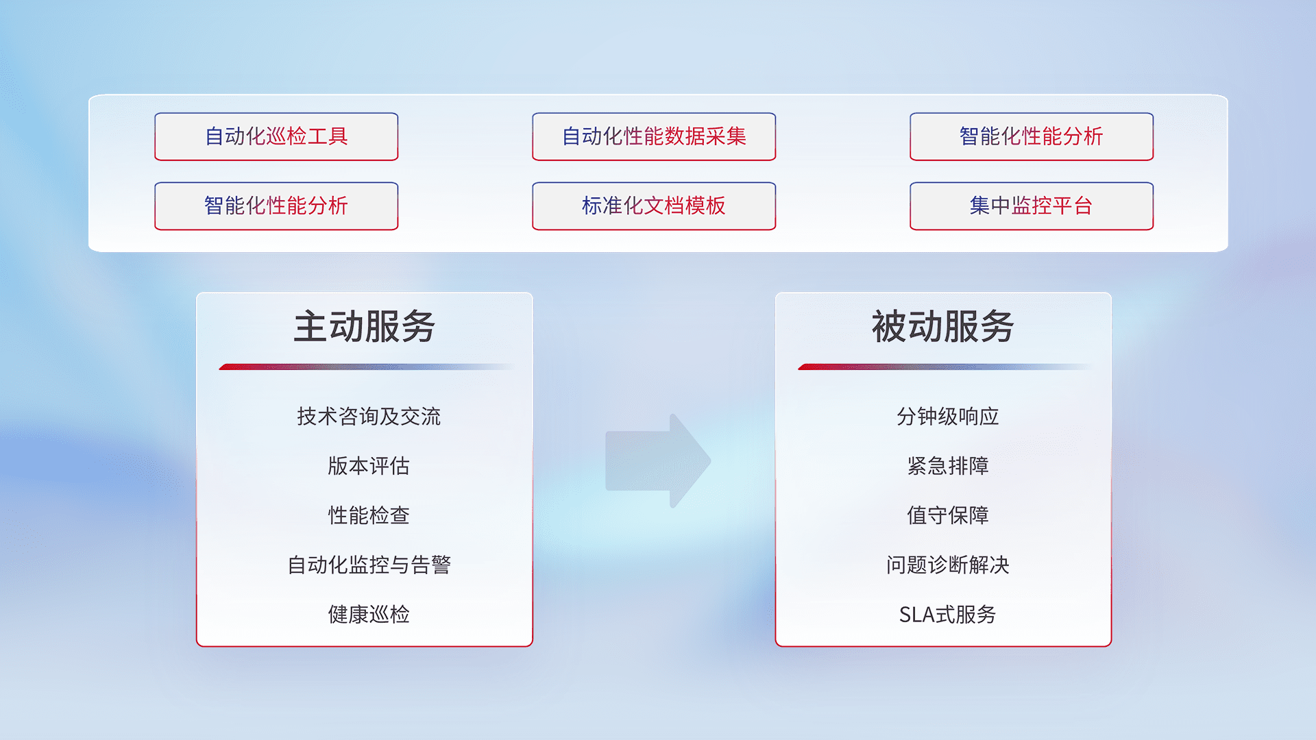 智能化工具和标准化文档,,,保障服务质量,,,提供主动服务(包含技术咨询、、、版本评估、、、性能检查、、自动化监控与告警、、、健康巡检)和被动服务包含(分钟级响应、、、紧急排障、、值守保障、、、、问题诊断解决、、、、SLA服务)。。